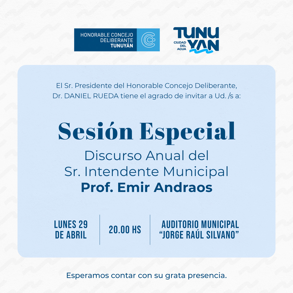 Este lunes desde las 20 horas, en una Sesión Especial, tendrá lugar el primer discurso anual como intendente de Tunuyán, el Prof. Emir Andraos. Para dar inicio al periodo de sesiones ordinarias del periodo 2024.